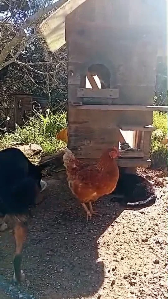 The chickens roam in the orchard in the shade. They keep the area free of fruit flies. At night they roost and give us eggs. Their manure gives energy to the trees. We never have to mow again. They do this with full conviction.